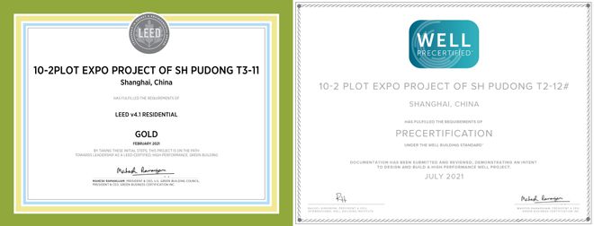 世博园区低碳实践,从能源低碳化、绿色建筑建设、低碳交通系统建设、资源节约和综合利用、提升景观碳汇建设、智慧人文建设六大方面着手。目前已获得绿色建筑的项目中100%获得绿色建筑二星级及以上标识,其中获得三星级标识的绿色建筑比例达到61%。保利·世博天悦住宅项目毗邻黄浦江,项目获得绿建二星级设计标识,其中 10、11、12 号楼获得LEED金级预认证以及 WELL 金级预认证。