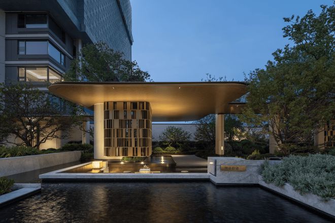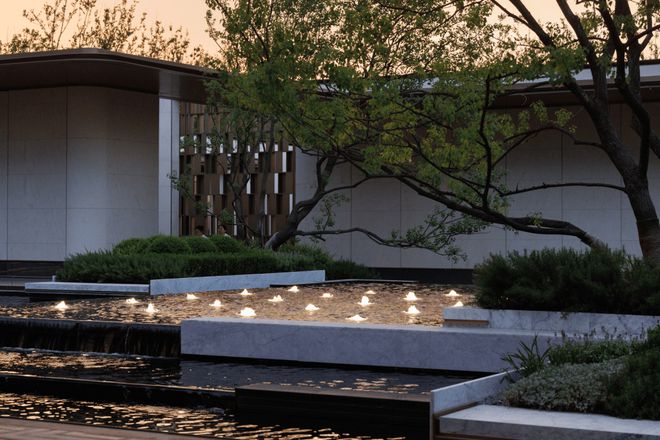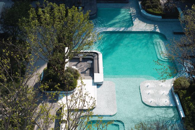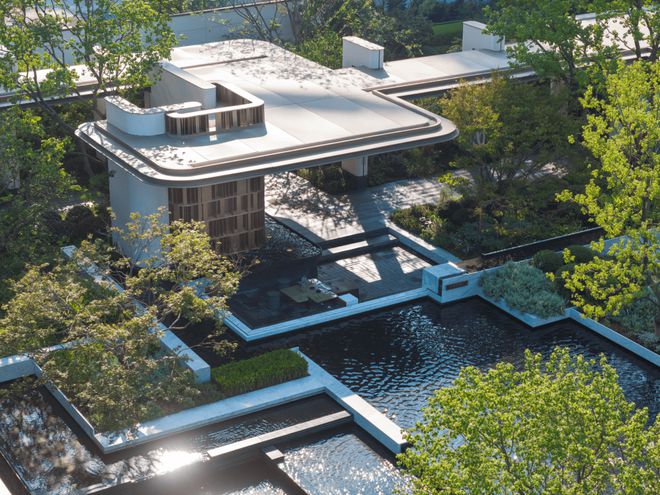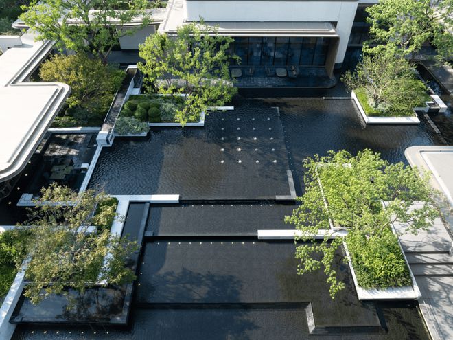 示范区首批次公开的约650㎡的无界水院,通过层层叠水与精选树种的巧妙搭配,展现了水院的悠然意境。项目近期开放的全新景观同样展现了大面积的水景。