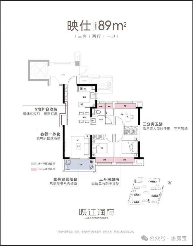 相对于开敞性社交空间的设计,卫浴场景的设计,需要兼顾的是私密与舒适。映江润府定制卫浴五大系统升级。建面约89㎡小户型,创新规划三分离卫浴,让沐浴的时刻,拥有独特的仪式感,同时,为小户型产品,解锁了不输双卫的居住体验。