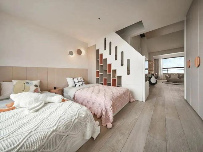 楼梯分隔了起居室与两张儿童床,楼梯底部的三角区域也被完美的利用了起来,用于收纳玩具必一体育和童话书。