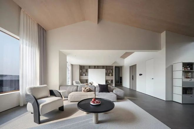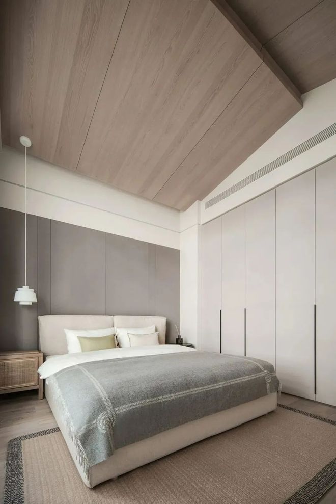 位于顶层的卧室,有着木色和灰色交织的高级感,宁静淡雅的本质也随着时光的流逝而逐渐流露了出来。