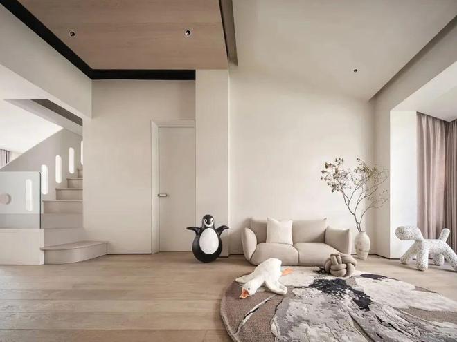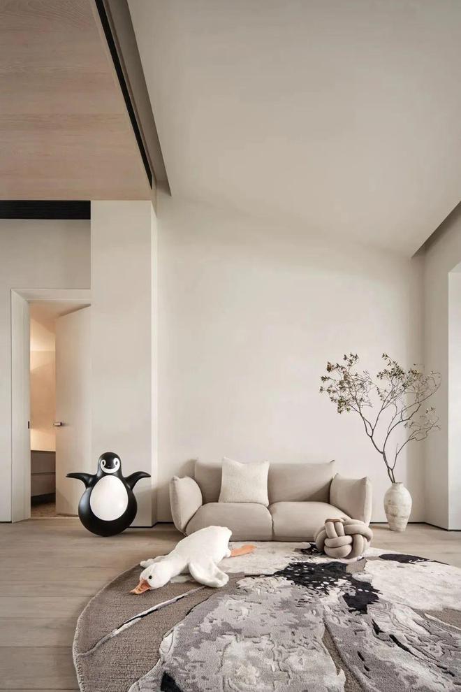 在另一侧起居室中,企鹅、小狗等可爱的玩偶建构了更多的生命活力,为孩子和爸妈之间的亲密时光注入了更多的美好。