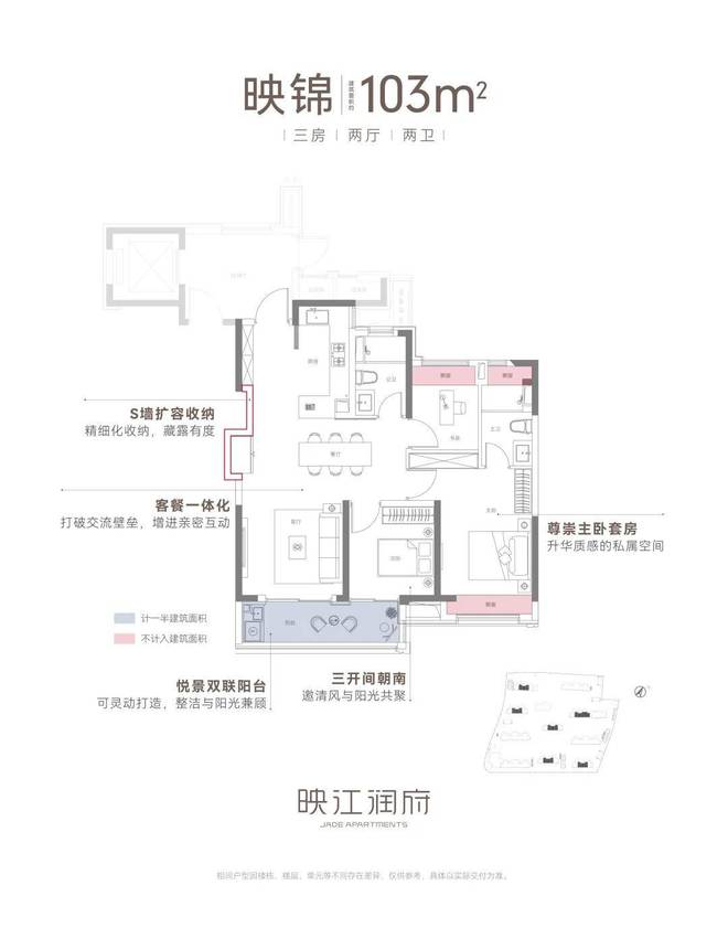 中间套的建面约103㎡,同样非常优越,且中间套的价格比边套更有优势,创新S墙,餐客一体化,社交型厨房,双联阳台这些共性的优势被完美的保留同时,南北通透的主卧套房,基于轩敞的空间尺度拥有了更灵动的收纳空间,实用性和舒适性兼备。