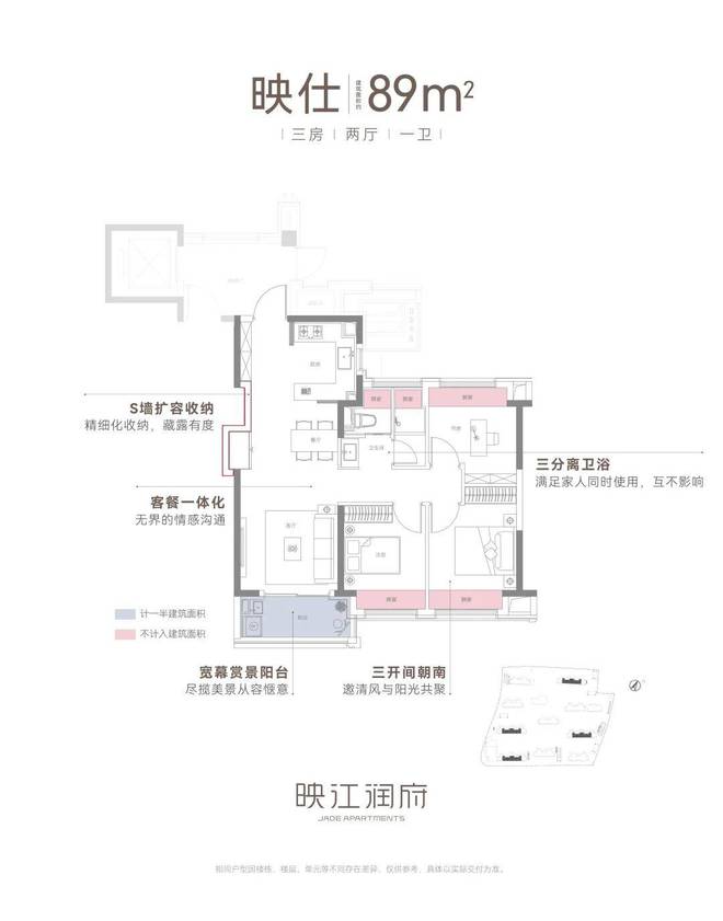 浏览次数:建面约89㎡小户,打造以创新S墙为代表的收纳系统,完美解决小户型的收纳问题。主卧、主卫、次卧多飘窗设计,用更多的灵动空间,解锁了生活的不同场景,还打造了媲美双卫的三分离卫浴,买到手的是一卫的小户,实现的是不输双卫的居住体验,谁看不说绝!