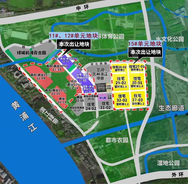 其中,11单元、12单元为商住用地,紧邻滨江酒店、湾区水岸、轨交站点等功能性节点,15单元为住宅用地。
