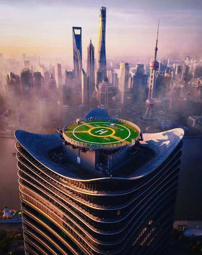 在1号楼的楼顶有一个直升机停机坪,有私人飞机的客户终于能有机库了。而且每栋楼的顶层都设有天际会所,空中酒吧,站在这里几乎能俯瞰整个上海的繁华。