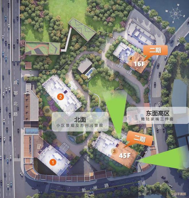 ▶该栋楼南向可观3000㎡中央景观绿化;中间户型6层以上北可观苏州河景,且两侧都能看见苏州河景。