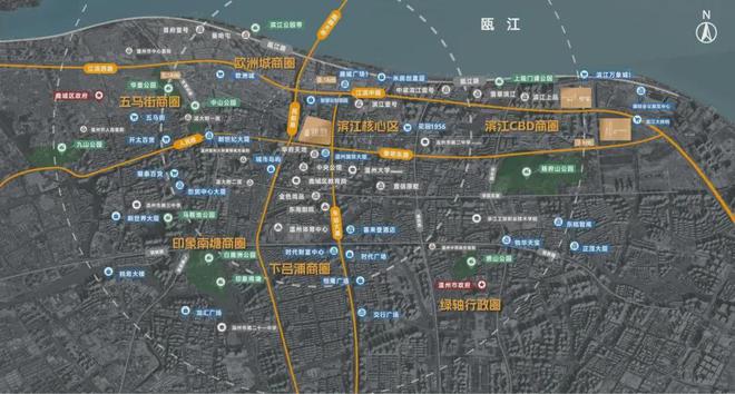 纵观城市版图,润府与鹿城广场、瓯江畔围合出烫金1公里高端生活住区,占据南北纵横的车站大道、民航路,以东西主干道江滨中路和黎明路链接滨江商务区等繁盛图景,同时,白鹿洲公园、中山公园、东南剧院等人文地脉环绕在侧,拥享城市的自然盛景。