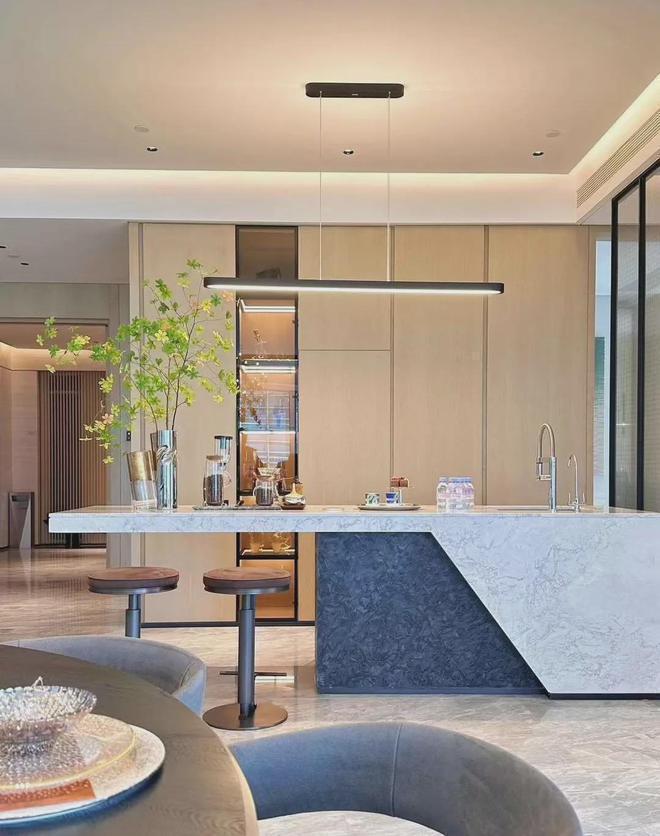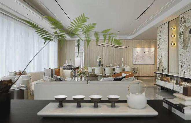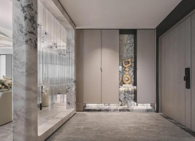 东区建面约320户型,将艺术感进一步融入日常中。特别设计的专属门厅空间,是从电梯厅延伸到家,如同一处艺廊,放慢人的情绪;室内选用了浅金色奢石(外界也称其为“芬迪白大理石”)作为主要的石材,曲面的木饰面也为浅色,整体给人以明亮感。