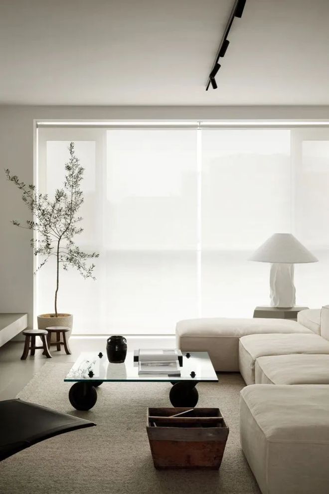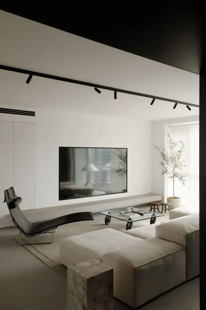 四白落地的墙面,浅灰色混凝土地坪和无主灯设计,让空间更加简洁干净的同时,也为屋主希望‘家’和‘画廊’空间的结合成为可能。