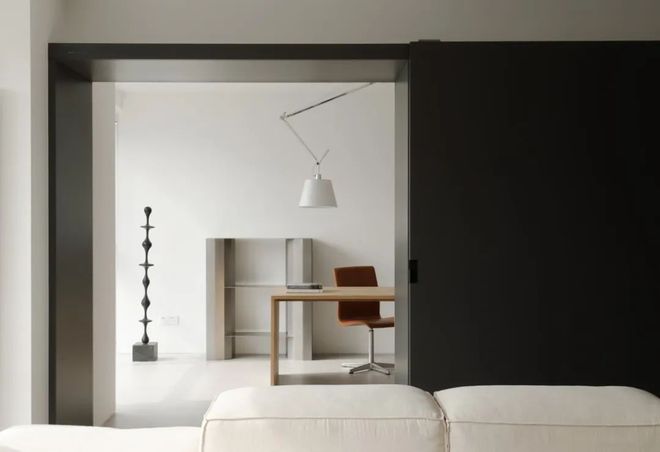 客厅沙发背后的深灰色烤漆书墙背后是书房的所在,以一扇2m长的深灰色烤漆移门控制开合,形成,形成“1+1”的可变空间组合,既满足了收纳需求,又实现了社交空间与私人空间的转换。