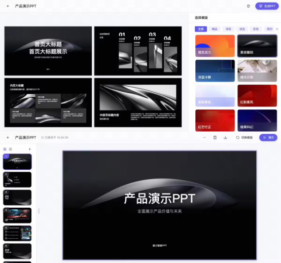 除言之有物外,通义在设计排版方面也满足了用户的多样需求。基于通义万相视觉大模型,PPT创作可以支持文生图、图片素材库中搜索匹配,让配图更符合PPT需求。无论是工作汇报、学术演讲还是日常分享,首批上线的模版能满足不同场景下的需求。
