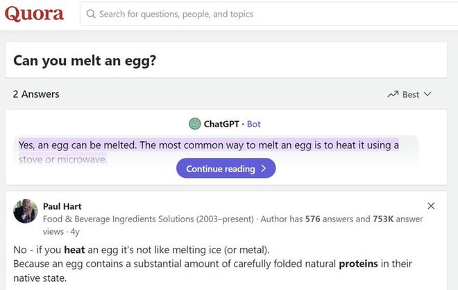一开始一些用户使用ChatGPT生成答案,然后秒成Quora的“专家”,后来Quora直接在页面上集成了ChatGPT生成的答案,而这些错误的答案又传播到了谷歌的搜索结果中。