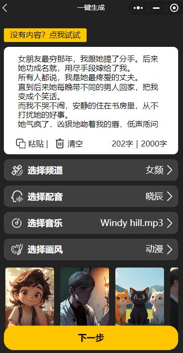 目前小程序能一次做3000字,新人可以免费做3次相当于9000字,几十分钟的视频。邀请好友注册还可以免费获得更多次数。如果你觉得不过瘾,还可以试试专业网页版(巨日禄AI漫画)。